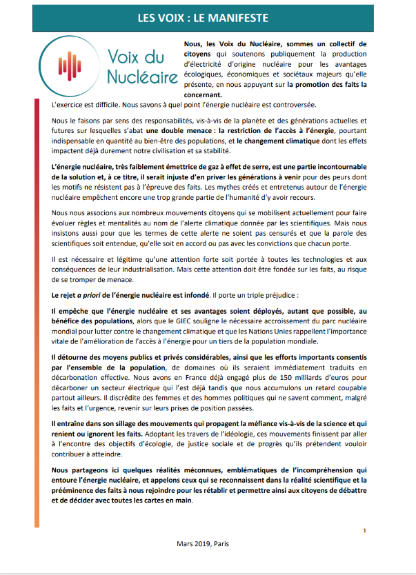 Nous partageons notamment les recommandations et les analyses du GIEC : l’augmentation significative de la part du nucléaire est nécessaire pour combattre le changement climatique, et le frein principal à son nécessaire développement est son acceptation sociale.