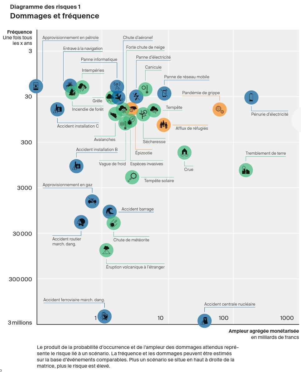 L’Office Fédéral de la Protection Publique (OFPP) Suisse a réalisé fin 2020 ce diagramme de risques, positionnant des évènements en fonction de leur probabilité d’occurrence et de leurs dommages attendus (ici en coût financier). Plus un évènement est situé en haut à droite, plus le risque qu’il représente (danger x probabilité) est élevé.