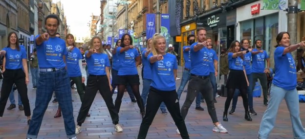 Le mercredi 3 novembre, l’équipe est partie le matin pour s’entraîner pour le flashmob de l’après-midi rue Buchanan, un véritable « Bouge ton nuc » en plein centre de Glasgow. NI-YGN avait organisé cette activité en collaboration avec un groupe de danseurs professionnels qui soutiennent le nucléaire – ce sont eux qui dans la vidéo sur You Tube (voir lien ci-dessous) dansent jusqu’à la minute 3:10, après quoi les autres activistes rejoignent la chorégraphie. Toutefois, parmi les danseurs, le jeune qui fait du breakdance n’est pas un danseur professionnel, mais bien un ingénieur nucléaire de notre équipe qui travaille au Royaume Uni, Eduardo Cuoc !