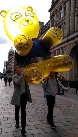 La journée s’est prolongé par des discussions sur le nucléaire avec les gens dans la rue. Nos activistes ont porté le Gummi Bär avec les banderoles ; Myrto est partie à la blue zone avec Jadwiga et les autres. Dans le George Square, deux étudiantes journalistes ont voulu nous interviewer pour avoir le point de vue des pro-nucléaires. Mais parmi les passants il y avait aussi des anti-nucléaires. Un allemand s’est approché et nous a signifié que ce que nous faisions était “très mal”, mais il est parti sans vouloir en débattre. Nous avons pu constater que la question du nucléaire est assez controversée et suscite des sentiments forts parmi les citoyens.
