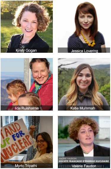 – A l’étranger, avec Kirsty Gogan d’Energy For Humanity, Jessica Lovering du Breakthrough Institute, les membres de Mothers for Nuclear comme la blogueuse Iida Ruishalme, la twitteuse Katie Mummah, et bien d’autres qui vont à contre-courant de la tendance traditionnelle des femmes de méfiance vis-à vis le nucléaire.