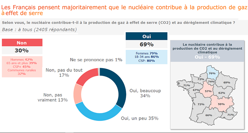 Le sondage conduit en 2019 pour Orano par BVA montre que 69% des Français pensent que le nucléaire contribue à la production de gaz à effet de serre (CO2) et donc au dérèglement climatique. C’est déjà beaucoup, mais quand on regarde les résultats dans le détail, on voit qu’il y a quasiment deux fois plus de femmes que d’hommes dans ce chiffre (79% des femmes, 40% des hommes) ! *