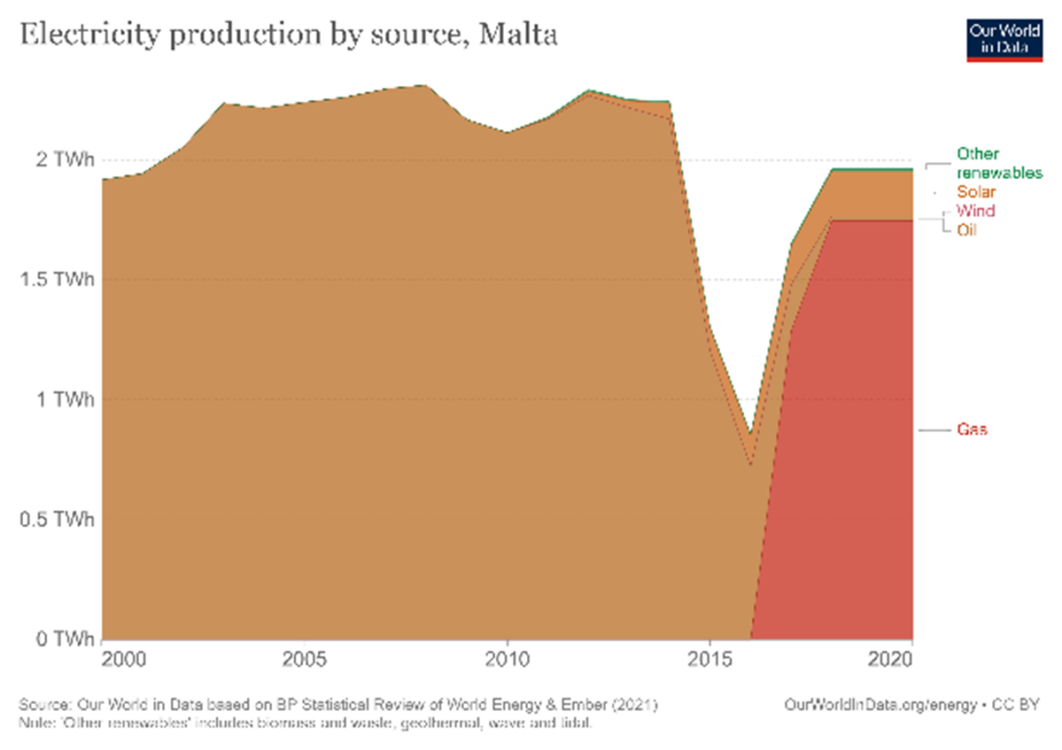 Ce n’est donc pas une surprise si en 2015, la centrale au fioul lourd de Delimara a été convertie en une centrale au GNL. Dans le même temps, le recours à l’interconnexion avec le réseau européen s’est accru rapidement – au point qu’une deuxième connexion est actuellement en construction. L’autre démonstrateur de l’insuffisance des énergies renouvelables à l’approvisionnement des îles maltaises, c’est que tous les toits accessibles y sont déjà recouverts de panneaux solaires et qu’il reste cependant nécessaire de construire des fermes solaires en dehors des zones de développement.