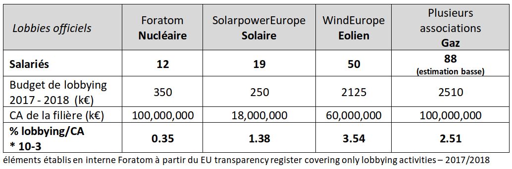 - Les associations environnementales présentes à Bruxelles ne sont pas comptabilisées ici, pourtant elles concentrent leurs moyens considérables de lobbying énergie/climat en faveur des ENR, parfois du gaz et contre le nucléaire