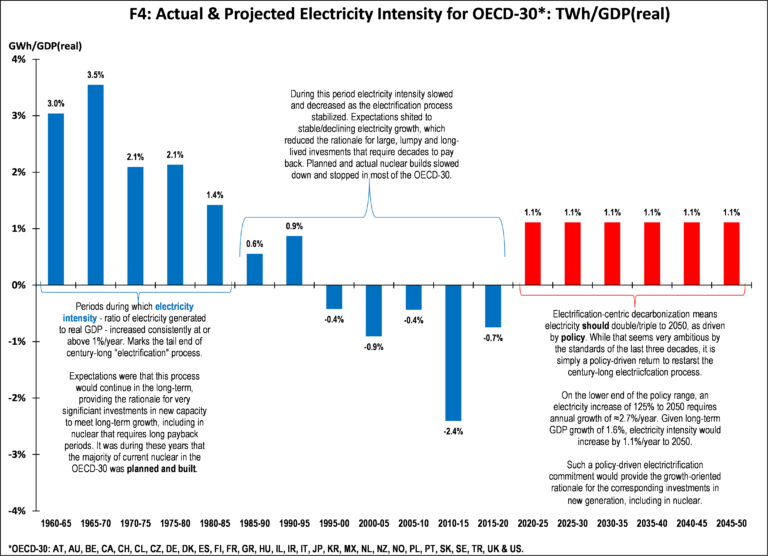 Les prévisions en matière de croissance du marché futur de l’électricité sont essentielles pour les nouvelles constructions nucléaires, et le ralentissement puis la stagnation du développement de l’électrification au sein du groupe de ces 30 pays de l’OCDE a été sous-estimée en tant que cause du faible nombre de nouveaux réacteurs nucléaires qui y ont été construits au cours des deux dernières décennies. Pour montrer cela, j’utilise un autre indicateur, l’intensité électrique, définie par la quantité d’électricité générée (en GWh) rapportée au PIB (en $).