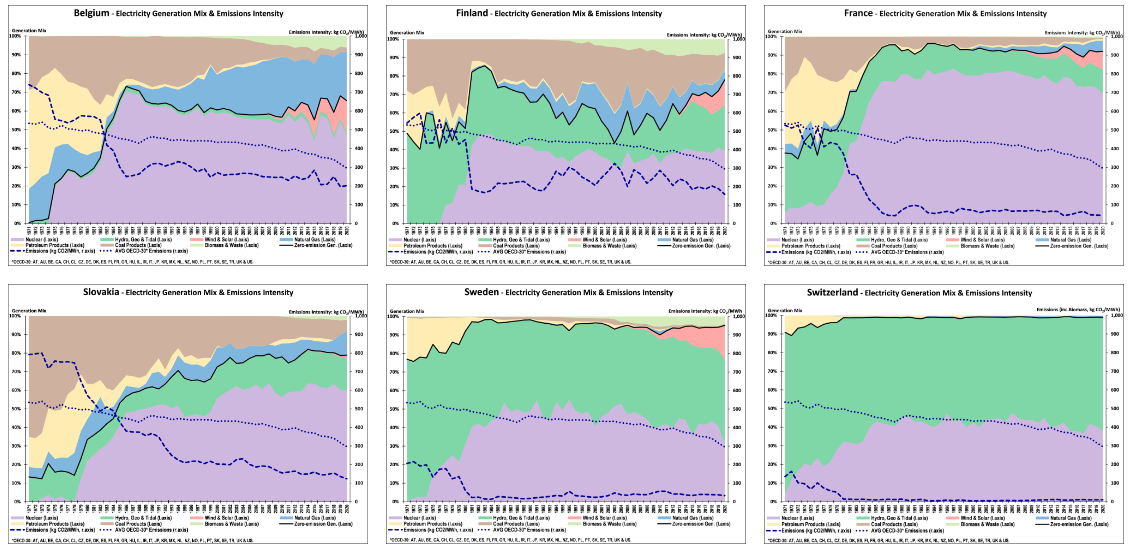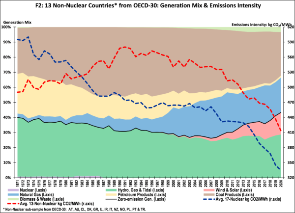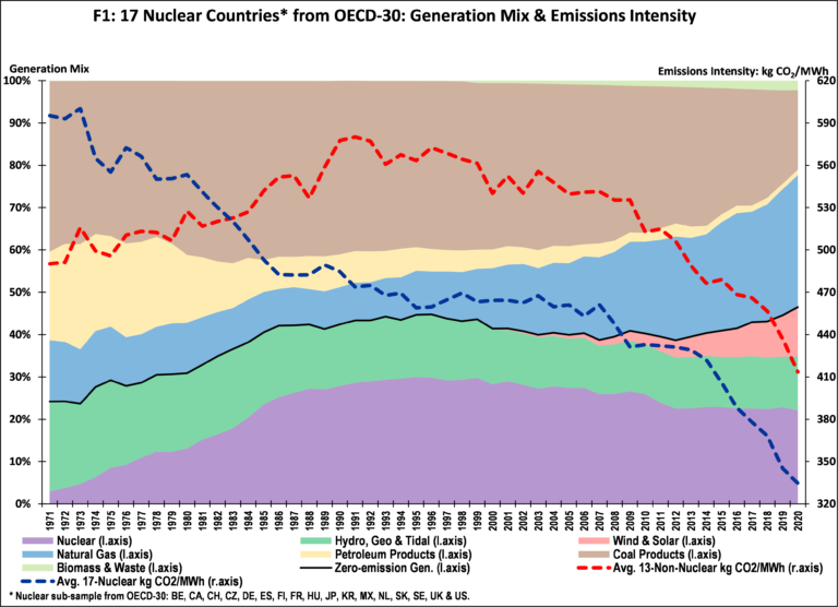 Pour répondre à la première question dans quelle mesure l’énergie nucléaire a contribué à la décarbonation, je distingue, parmi les 30 pays de l’OCDE, « les 17 Nucléaires » qui ont produit de l’électricité nucléaire au cours des 30 dernières années et les « 13 Non-Nucléaires » qui n’en ont pas produit. Chaque graphique montre le pourcentage dans le mix électrique de nucléaire, d’hydraulique, d’éolien et de solaire (ensemble), de charbon, de pétrole, de gaz et de biomasse, ainsi que l’intensité carbone du mix en kgCO2/MWh.