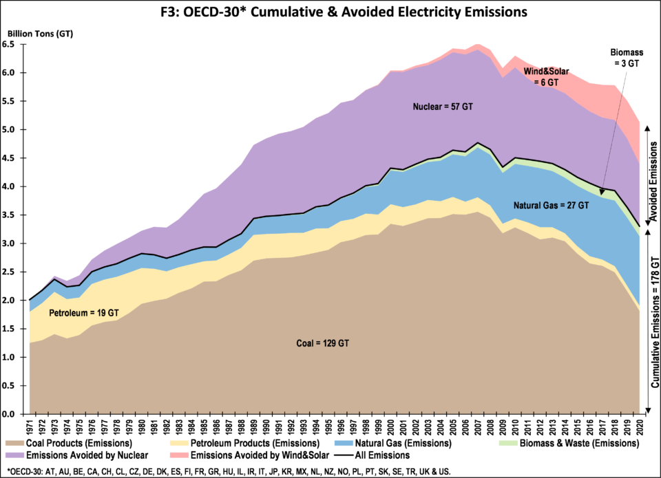 Combien de CO2 a été émis par les 30 pays de l’OCDE depuis 1971 pour produire de l’électricité, et combien a été évité grâce au nucléaire, à l’éolien et au solaire ?