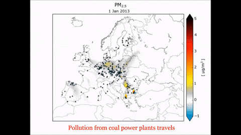 Figure 4 : Pollution des centrales à charbon se propageant à travers l'Europe (2013)
