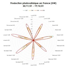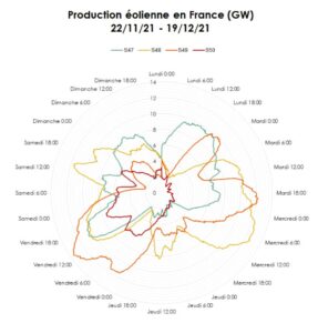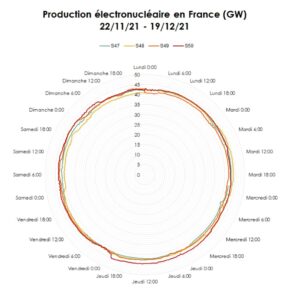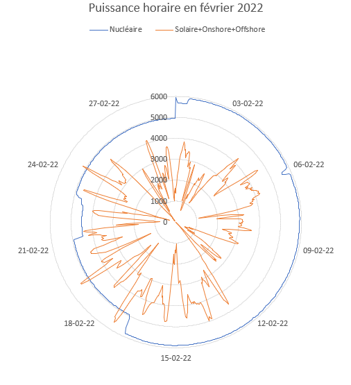 Figure 3 : Illustration de l'intermittence du solaire et de l'éolien, comparée à la production nucléaire