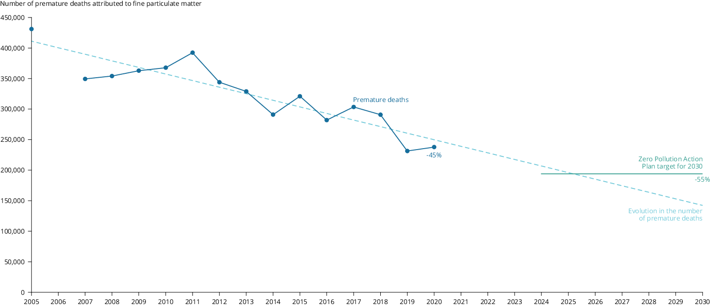 Selon le Conseil européen [1], les normes environnementales doivent être durcies pour respecter les dernières lignes directrices de l’Organisation mondiale de la Santé (OMS). Malgré une diminution drastique des polluants depuis 1990, les émissions liées à l’activité humaine seraient encore responsables de 300 000 décès prématurés en Europe chaque année. De nouvelles normes, actuellement à l’étude, doivent rapidement entrer en vigueur pour respecter les lignes directrices de l’OMS. Les particules fines PM2,5 sont considérées comme les plus dangereuses. Figure 1: Morts prématurées de 2005 à 2020 dans l’EU-27 attribuable à la concentration de particules fines au-dessus des lignes directrice de l’OMS et l’objectif européen « zéro pollution » |