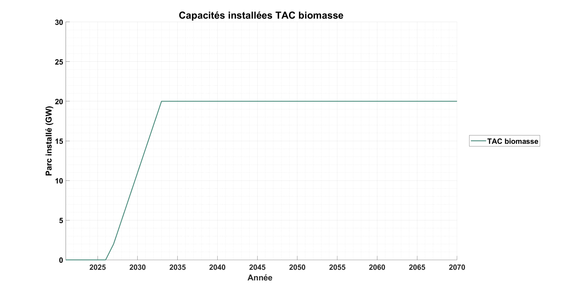 Celles-ci nécessitent normalement un combustible liquide ou gazeux. Le scénario prenant le parti d’éviter les paris technologiques liés à l’hydrogène, les TAC pourront par défaut être alimentées par du biodiesel et du bioéthanol, aisément disponibles et stockables. Cependant les agrocarburants et le biogaz devant être réservés en priorité aux derniers usages de mobilité lourde non électrifiables, le scénario propose d’utiliser un autre combustible pour ce type d’usage : le bois.