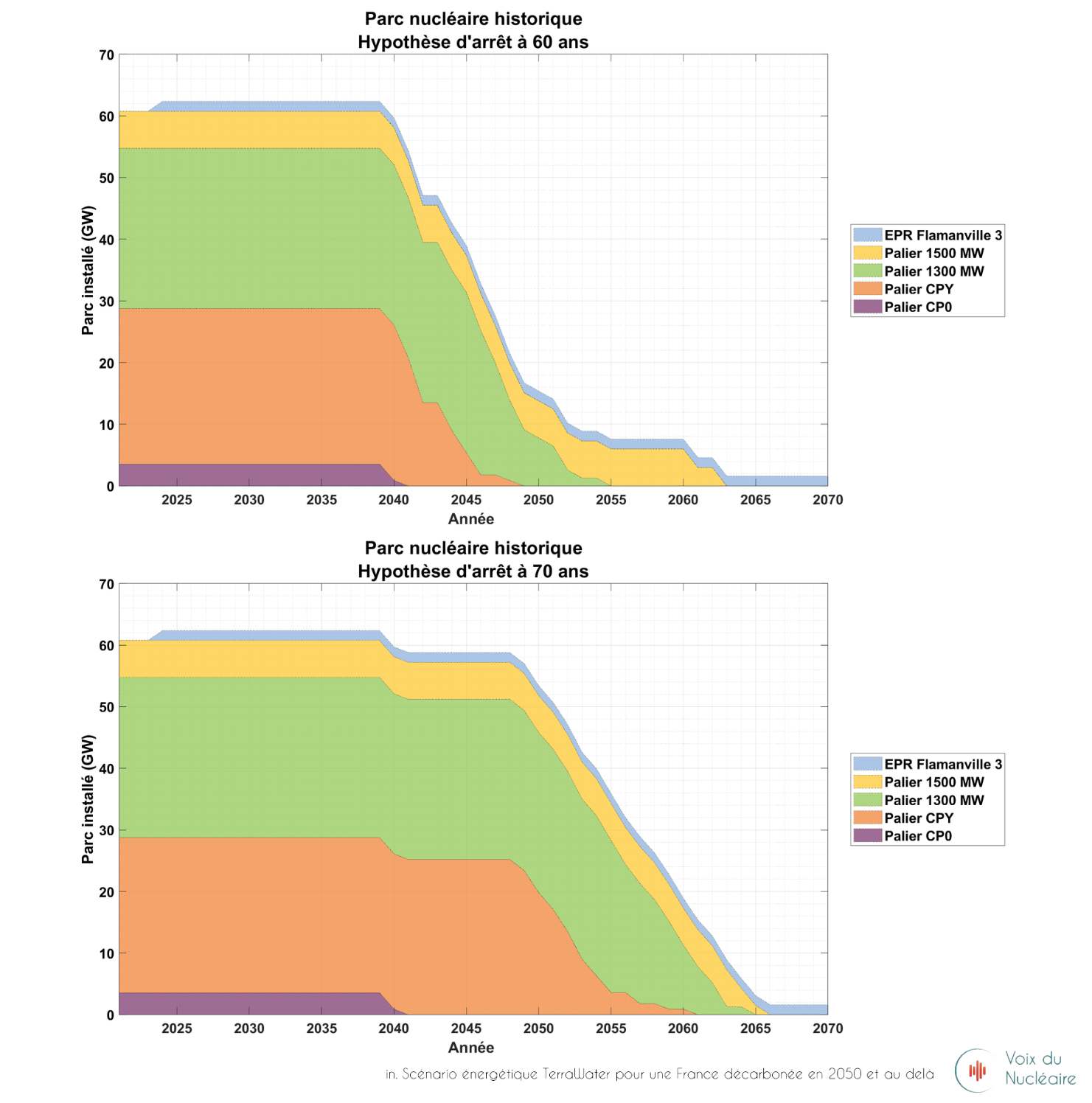 ⏳ Pour atteindre 80 GW sans faire appel à un rythme de construction des nouveaux réacteurs irréaliste, il est nécessaire de conserver environ 50 GW sur le parc existant jusqu’en 2045 au moins. Ce maintien implique que le début de l’effet falaise soit repoussé de 2040 à 2048, et que le déclassement des tranches soit organisé de manière linéaire.