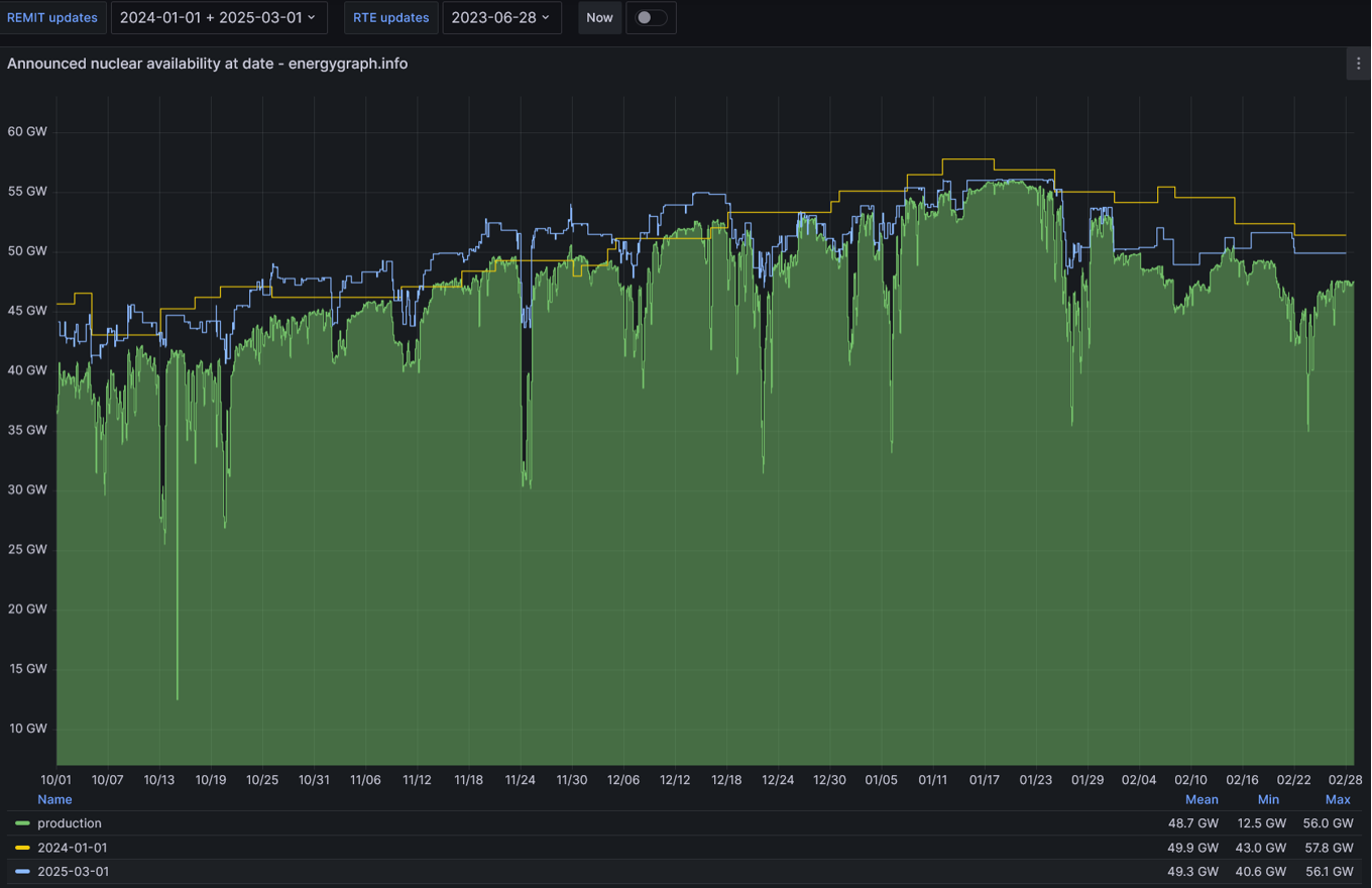 La période étudiée ici se concentre sur la période hivernale fin 2024 début 2025 à dessein : L’hiver est une période de forte consommation et de faible production de solaire. Par conséquent, c’est l’hiver que le parc nucléaire est le plus sollicité et la période lors de laquelle sa disponibilité est la plus critique.