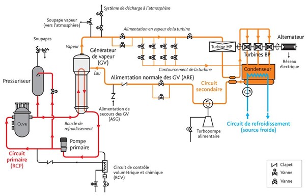 Les réacteurs à eau pressurisée fonctionnent grâce à la fission des atomes d’uranium, qui génère une importante chaleur dans le « cœur » du réacteur. Ces derniers utilisent de l’eau fluide ou « légère » (H2O) comme caloporteur – le produit chargé de récupérer la chaleur produite par le cœur – mais aussi comme modérateur. Cette eau est portée à une température de 300°C, mais elle est maintenue sous une grande pression (155 atmosphères [2]) dans le circuit primaire, afin d’éviter qu’elle ne s’évapore. Cette eau primaire va chauffer l’eau d’un circuit secondaire à travers des échangeurs de chaleur ce qui génère de la vapeur. La vapeur générée actionne une turbine couplée à un alternateur, ce qui permet de produire de l’électricité.
