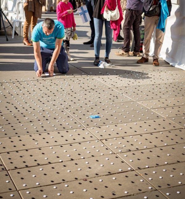 – Installation de la Fê(ai)te(s) du Nucléaire Paris : maquette de la centrale nucléaire de Fessenheim à l’échelle 1/4000 au milieu des éoliennes qui sont nécessaires pour produire la même quantité annuelle d’électricité.